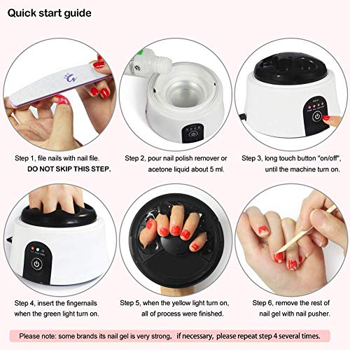 • Easy to Use: When you turn on gel nail steamer and put fingernails inside (do not touch acetone solution), the machine will works automatically. When the yellow indicator is turn on, the all of process is finished.