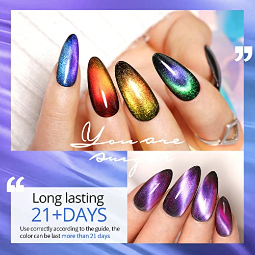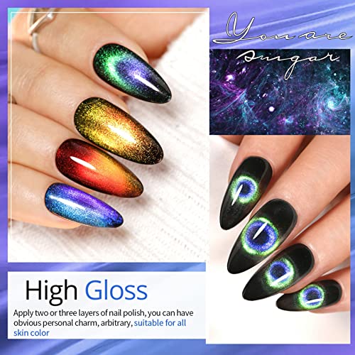 - 【Super 9D cat magnetic effect】Super 9D effect, combine the chameleon and cat magnetic,the magent stick, offer you perfect nail design effect, beautiful shades of popular and trendy colors are suitable for all seasons and daily routine life!. The gel will not only make you stand out but also it will make you catch other people's eyes carelessly.