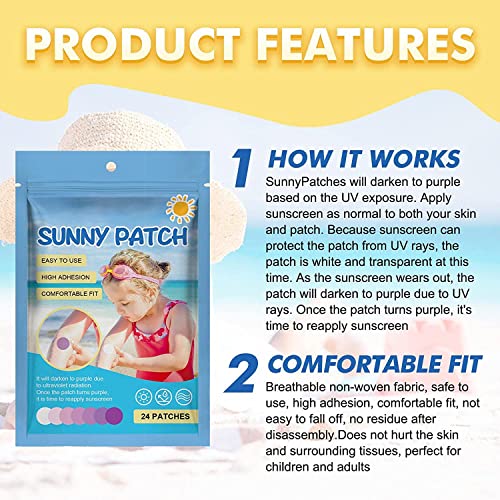 • Sunscreen Reapplication Alert: These patches will change color from white to purple when exposed to UV rays.This means your sunscreen is wearing off and you need to reapply it depending on the sun's brightness.