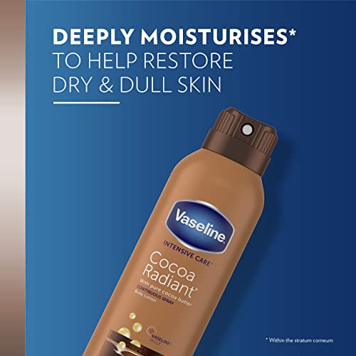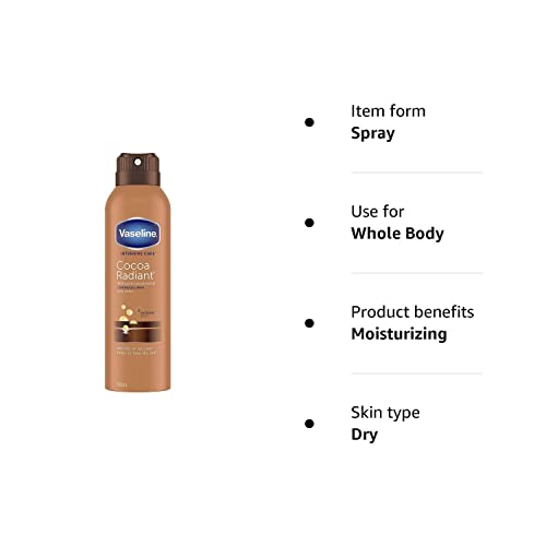 - Vaseline Intensive Care Cocoa Radiant Spray Moisturiser 190 ml is a skin cream spray with a light, non-greasy formula which absorbs in seconds providing easy application