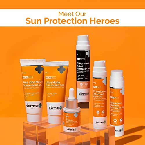 - NON-GREASY & FRAGRANCE-FREE: Say goodbye to the greasy and oily finish of typical sunscreens. The Derma Co. 1% Hyaluronic Sunscreen Aqua Gel is fragrance-free and doesn’t clog your pores. The presence of 1% concentration of Hyaluronic Acid in this sunscreen makes it quick to absorb and provides intense hydration to the skin. Extremely lightweight in nature, the sunscreen dissolves like water, hence the name ‘Aqua Gel’.