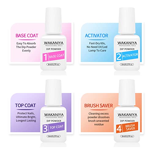 • ❤ SAFE/NO NEED CURING: WAKANIYA Dip Nails Set is No LED nail lamp required for curing nail, which is better for your skin and nail, suitable for all kinds of nails. Dip powder can dry in 10 seconds after dipping, it save your 50% applying time, make your nail design quicker and easier
