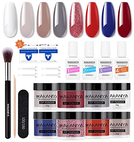 • ❤ HEALTHY & HARMLESS: WAKANIYA 8 colors Dipping Powder Starter Set make with healthy formula to help nails grow stronger and healthier. These doesn't damage the nail bed and available for air-dry.(wakniya dip nails kit contains 4 dip powder liquid + 8 color powder + 10 remover wrap + 1 nail brush + 1 nail file + 1 wood stick)