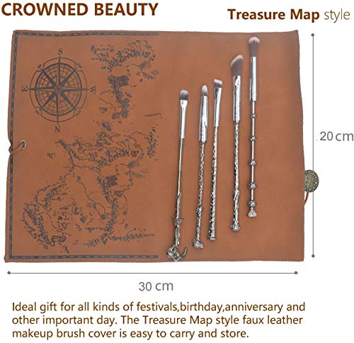 - Includes : 5 makeup brushes with handles replicating the wizard wands, 1 treasure map style faux leather makeup brush cover, 1 packing box.