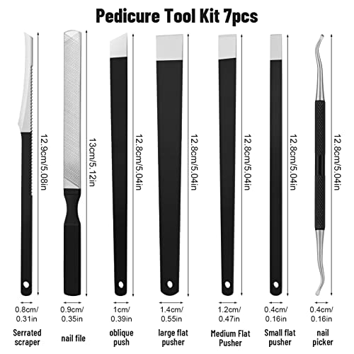 - Valuable Pedicure Set:7 Tools With a storage bag. including:1* Ingrown Toenail File, 1*Toenail Lifter, 1*Metal Nail File ,1*Nail Pusher, 1*Scraping Knives, 1*Inclined Knife, to help you stay away from nail problems.