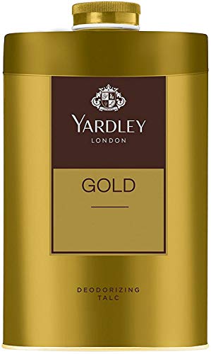 - Yardley London GOLD Deodorizing Talc Talcum Powder Men SIZE : - 100gm Details : GOLD Deodorizing Talc Talcum Powder Men 100gm GOLD talc combines fougere and green, fresh notes on a light musky base. Use this talc liberally on your body round the year for an elegant stride and for that fresh feeling synonymous with Yardley. Yardley London is famous throughout the world as a purveyor of quality fragrances and soaps. Yardley London has two Royal Warrants and prides itself on its wide range of beautiful, quality floral fragrances and ancillary products. Inspired by Englands diverse and varied flowers, Yardley London specialise in the creation of fragrances that are based around one or two key linear notes, a note that remains constant throughout the
