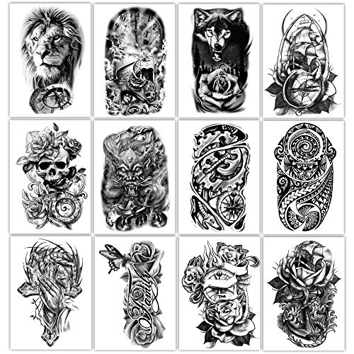 Yazhiji 36 Sheets Temporary Tattoos Stickers, 12 Sheets Fake Body Arm Chest Shoulder Tattoos for Men or Women with 24 Sheets Tiny Black Temporary