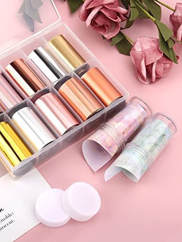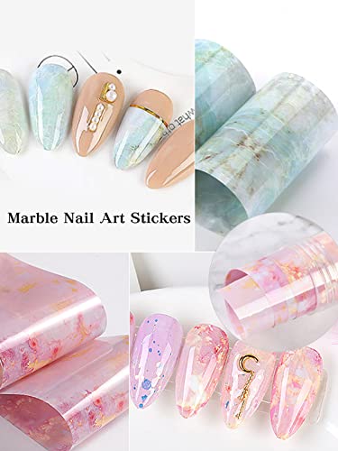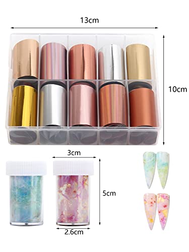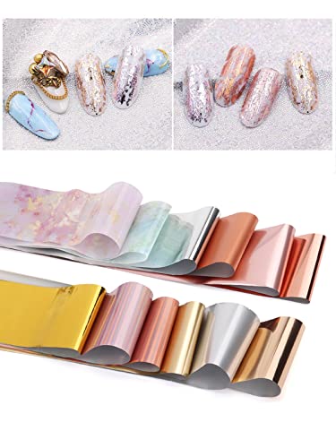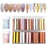 - đ«ăVarious PatternsăPackage includes 12 rolls kinds designs of nail foil transfer sticker(10 rolls metallic color nail holographic paper and 2 rolls marble series nail foils nail art adhesive sticker). you can apply with your nail polish, gel nail polish or foil glue to give them a full play.
