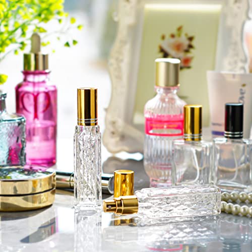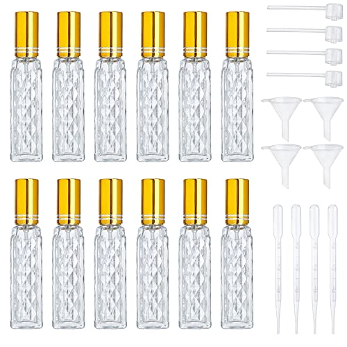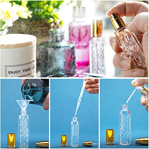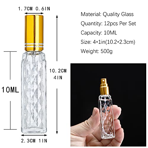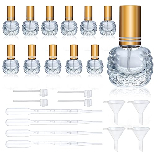 - Empty Refillable Bottle: 12 x 10ml glass fine mist spray bottle, 4 x funnels, 4 x droppers and 4 x perfume dispenser pump transfer tools. Easy to refill and no leakage!
