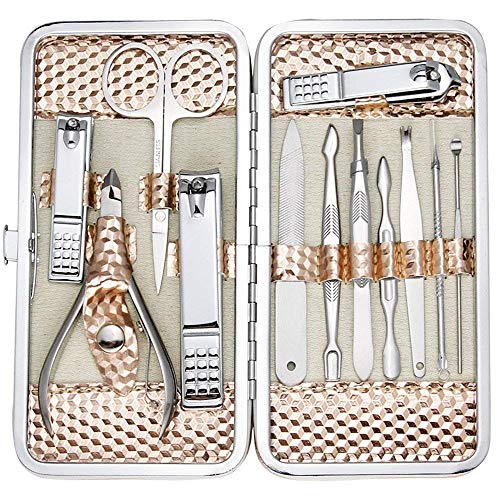 • LIGHT WEIGHT & PORTABLE: 12 pcs manicure pedicure kit comes with a beautiful and stylish case to protect the sharp tools, it is easily to close or open with a secure snap closure. The case is 3 inches by 6 inches, perfect for travel or just to keep it all in one place for home use.